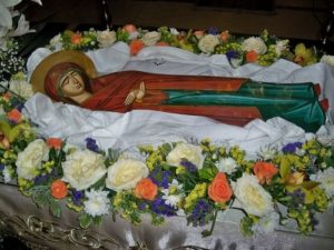 Παράδοξη επίσης είναι και η Κοίμηση της Θεοτόκου. Συνυπάρχουν σε αυτή ο θάνατος και η ζωή. Έμεινε στον τάφο τρεις ημέρες. Μετά ξύπνησε. Πέρασε από τον θάνατο στην ζωή την αιώνια. Μετατέθηκε στους ουρανούς Και τώρα βρίσκεται ζωντανή ψυχικά και σωματικά στα ουράνια δώματα. Κοντά στον Χριστό. Και δέεται πάντα σ’ Αυτόν, τον Υιό και Θεό της για όλο τον κόσμο. Είναι η Δεομένη. Έτσι την εμφανίζει σχετική παράσταση των Κατακομβών. Με τα χέρια Της υψωμένα στον Θεό σε στάση ικεσίας.