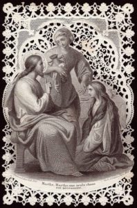 Ἡ Μαρία. Ἀντίθετος πρὸς αὐτὴν εἶναι ἡ Μαρία, ἡ ὁποία, εἶναι τελείως ἀκίνητος καθημένη πλησίον τῶν ποδῶν τοῦ Χριστοῦ, ἡ ὁποία ἤκουε τὸν λόγον Αὐτοῦ. Ἡ Μαρία, ἀπὸ τῆς στιγμῆς, ποὺ πάτησε τὸ πόδι Του ὁ Κύριος τὸ κατώφλι τῆς οἰκίας, ἔπεσεν εἰς πνευματικὴν ἔκστασιν, ἀπὸ τῆς ὁποίας τίποτε δὲν ἠδύνατο νὰ τὴν ἀπομακρύνῃ. Δὲν αἰσθάνεται, ἂν κάθεται ἤ πετᾷ, ἂν εἶναι γυνὴ ἐνώπιον ἀνδρός, ἔγινε πνεῦμα! Οὔτε βλέπει, οὔτε ἀκούει τί ἕτερον πλὴν τοῦ Ἰησοῦ. Δὲν χορταίνει νὰ τὸν κοιτάζῃ, νὰ τὸν ἀκούῃ, νὰ τὸν αἰσθάνεται παρόντα, ζῶντα, κοντά της, πολὺ κοντά της! Ὅταν τὴν κοιτάζῃ, ἡ χαρὰ της εἶναι μεγάλη, διότι ἀξιοῦται τοῦ βλέμματός Του! Ἐὰν ὁ Κύριος στρέψῃ πρὸς στιγμὴν κἄπου ἀλλοῦ τὸ βλέμμα Του, ἡ Μαρία παρακολουθεῖ τὸ βλέμμα Ἐκείνου διὰ τῶν ἰδικῶν τῆς βλεμμάτων. Ὅταν ὁ Κύριος διακόπτῃ πρὸς στιγμὴν τὸν λόγον Του, ἡ Μαρία ἐν τῇ ὀλιγολέπτῳ ἐκείνῃ σιωπῇ σἄν πρόβατον ἐνώπιον τοῦ μεγάλου Ποιμένος μηρυκάζει, ἀναχαράζει, ὅπως λέγομεν κοινῶς, τὰ λεχθέντα καὶ νέας μυστηριώδεις ἀποκαλύψεις λαμβάνει ἐν τῇ περισυλλογῇ ταύτῃ. Εὑρίσκει στενόχωρα τὰ τρεχάματα καὶ ποδοπατήματα τῆς ἀδελφῆς της. Δὲν σηκώνεται ἀπὸ τὰ πόδια τοῦ Ἰησοῦ, ἔστω καὶ ἂν τὴν ἐκάλει ὁ Λάζαρος ἤ ἡ Μάρθα. Εὑρίσκεται εἰς τὴν ὑπηρεσίαν τοῦ Κυρίου καὶ αὕτη, ἀλλὰ κατ’ ἄλλον τρόπον. Ἔχει δώσει εἰς Αὐτὸν τὴν ψυχὴν της ὁλόκληρον, ἡ ὁποία εἶναι φουντωμένη ἀπὸ ἀγάπη, ἐνώπιον τῆς ὁποίας τὸ ἔργον τῶν χειρῶν της εἶναι περιττὸν ἤ οὐχὶ κατάλληλον διὰ τὴν ὥραν ἐκείνην. Εὑρίσκεται ἐν θεωρίᾳ. Λατρεύει. Εἶναι ἑτοίμη νὰ δώσῃ τὸ αἷμα της, τὴν ψυχήν της!