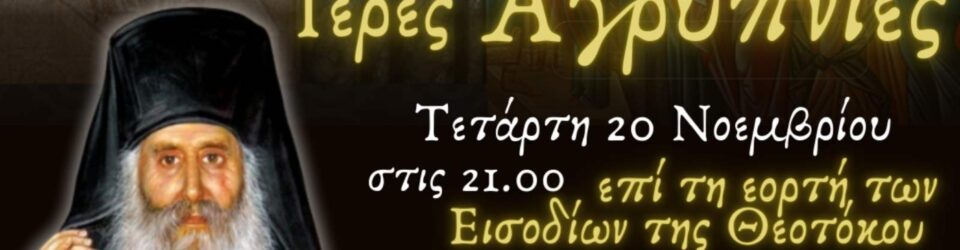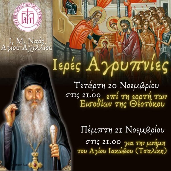 Την Τετάρτη 20 Νοεμβρίου 2024, καθώς και την Πέμπτη 21 Νοεμβρίου 2024, στις 9.00 το βράδυ, θα τελεσθούν Ιερές Αγρυπνίες για τα ΕΙΣΟΔΙΑ της Θεοτόκου και για τη μνήμη του Αγίου Ιακώβου του εν Ευβοία αντίστοιχα, στον Ι.Μ.Ν.Αγίου Αχιλλίου Λαρίσης.