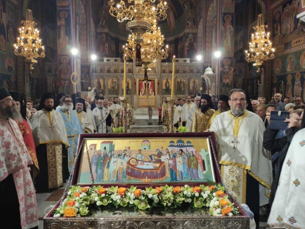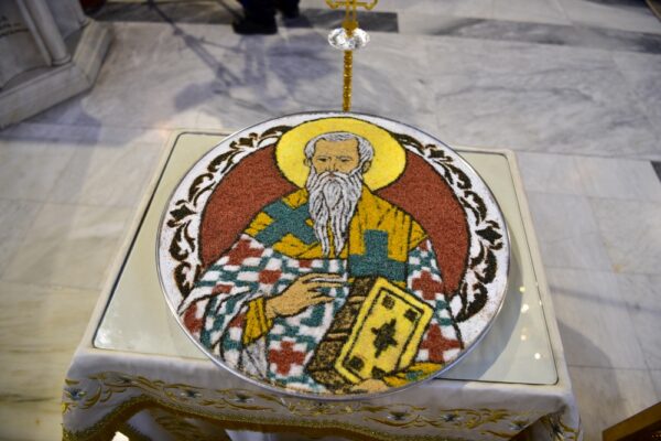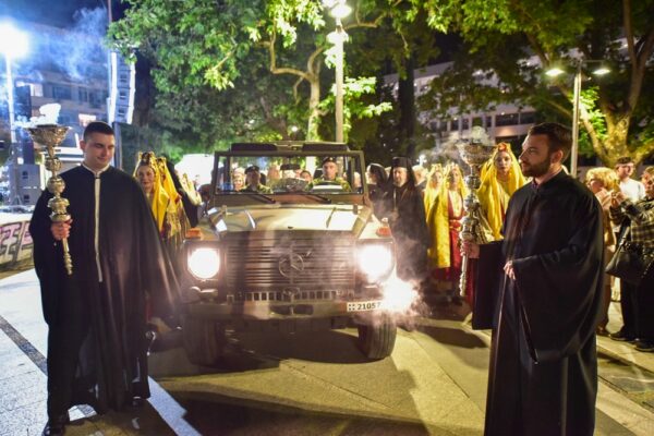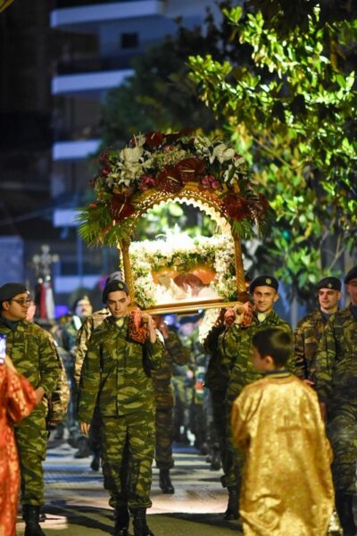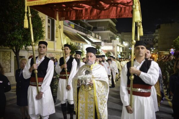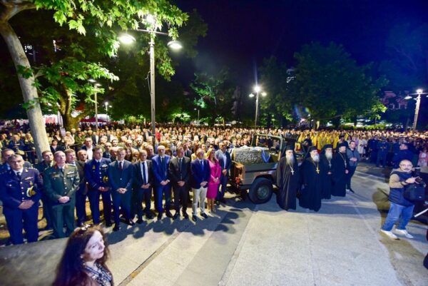 Μετά το τέλος του Εσπερινού, πραγματοποιήθηκε η Λιτανεία των χαριτοβρύτων Λειψάνων του Αγίου μας μέχρι την Κεντρική πλατεία της πόλεως μας, παρουσία των πολιτικών και στρατιωτικών αρχόντων του τόπου μας, καθώς και χιλιάδων Λαρισαίων. Ο σεπτός μας Ποιμενάρχης κ. Ιερώνυμος, δια θερμών λόγων, αμέσως μετά τη δέηση και την ακολουθία της αρτοκλασίας, ευχαρίστησε πρωτίστως, τους Σεβασμιωτάτους Ιεράρχες για την ευλογητή παρουσία τους, ενώ τόνισε την ανάγκη συστράτευσης πίσω από το ήθος του Αγίου μας, καθ’ όσον η εποχή μας όσο διαπιστώνεται έλλειμμα ήθους τόσο περισσότερο παρακμάζει.