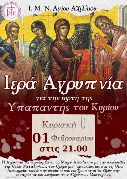 Την Κυριακή 1 Φεβρουαρίου 2026, στις 9.00 το βράδυ, θα τελεσθεί Ιερά Αγρυπνία, στον Ι.Μ.Ν.Αγίου Αχιλλίου Λαρίσης, για την εορτή της Υπαπαντής του Κυρίου.