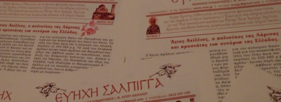Ημέρα της εορτίου μνήμης του Αγίου Αχιλλίου η 15η Μαΐου και η πόλις της Λάρισας εορτάζει και τιμά την εύηχο σάλπιγγα της Εκκλησίας και τον ακοίμητο φρουρό και προστάτη της! Ημέρα χαρμόσυνη για την Θεσσαλική πρωτεύουσα, κατά την οποία όλοι οι πιστοί προσέρχονται ευλαβικά στον Άγιό τους για να ανάψουν ένα κεράκι και να καταθέσουν […]