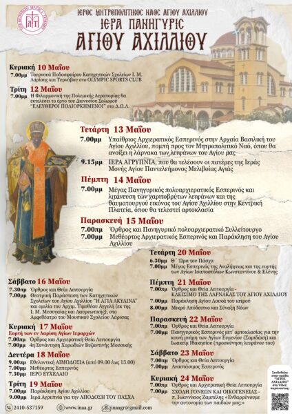 ΠΕΜΠΤΗ 14 ΜΑΪΟΥ7.00 μ.μ. Μέγας Πανηγυρικός πολυαρχιερατικός Εσπερινός και λιτάνευση των χαριτοβρύτων λειψάνων και της θαυματουργού εικόνας του Αγίου Αχιλλίου στην Κεντρική Πλατεία, όπου θα τελεστεί αρτοκλασία.